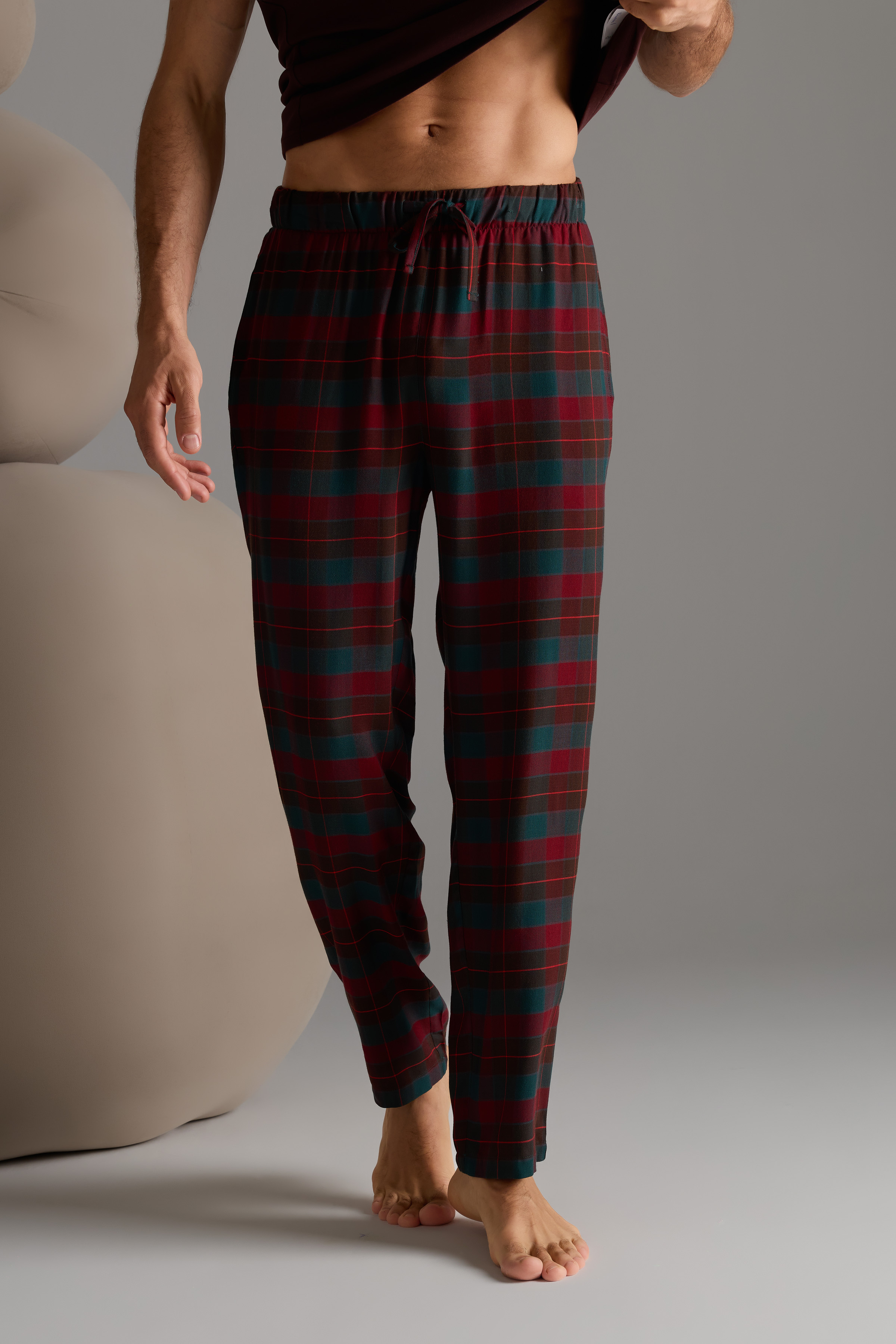 Bordo Ekose Desenli Erkek Dokuma Cepli Uzun Pijama Altı - 62178-PNT