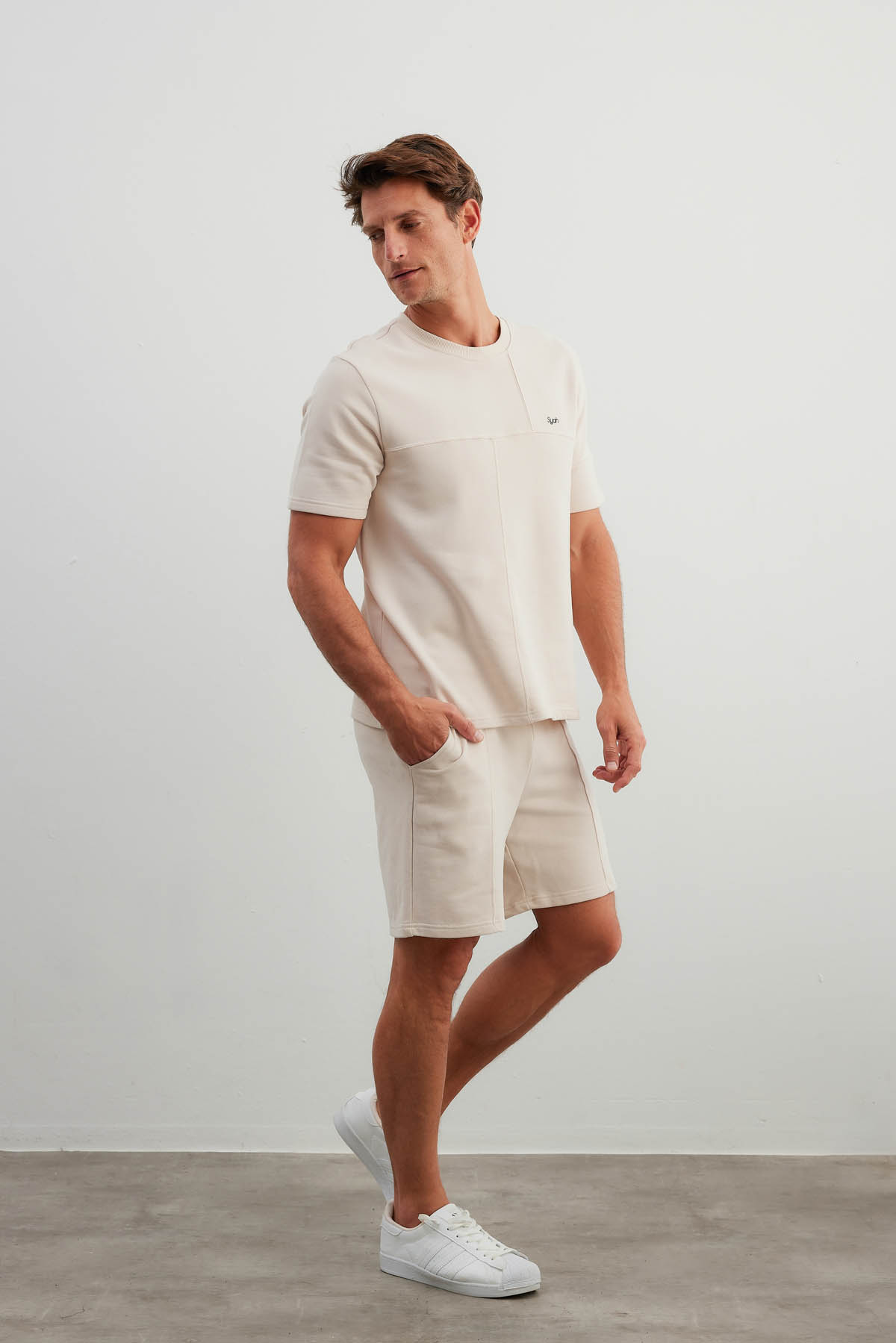 Bej Erkek Pamuklu Kesik Detaylı Kısa Kollu T-shirt Cepli Şort Takımı - 40520