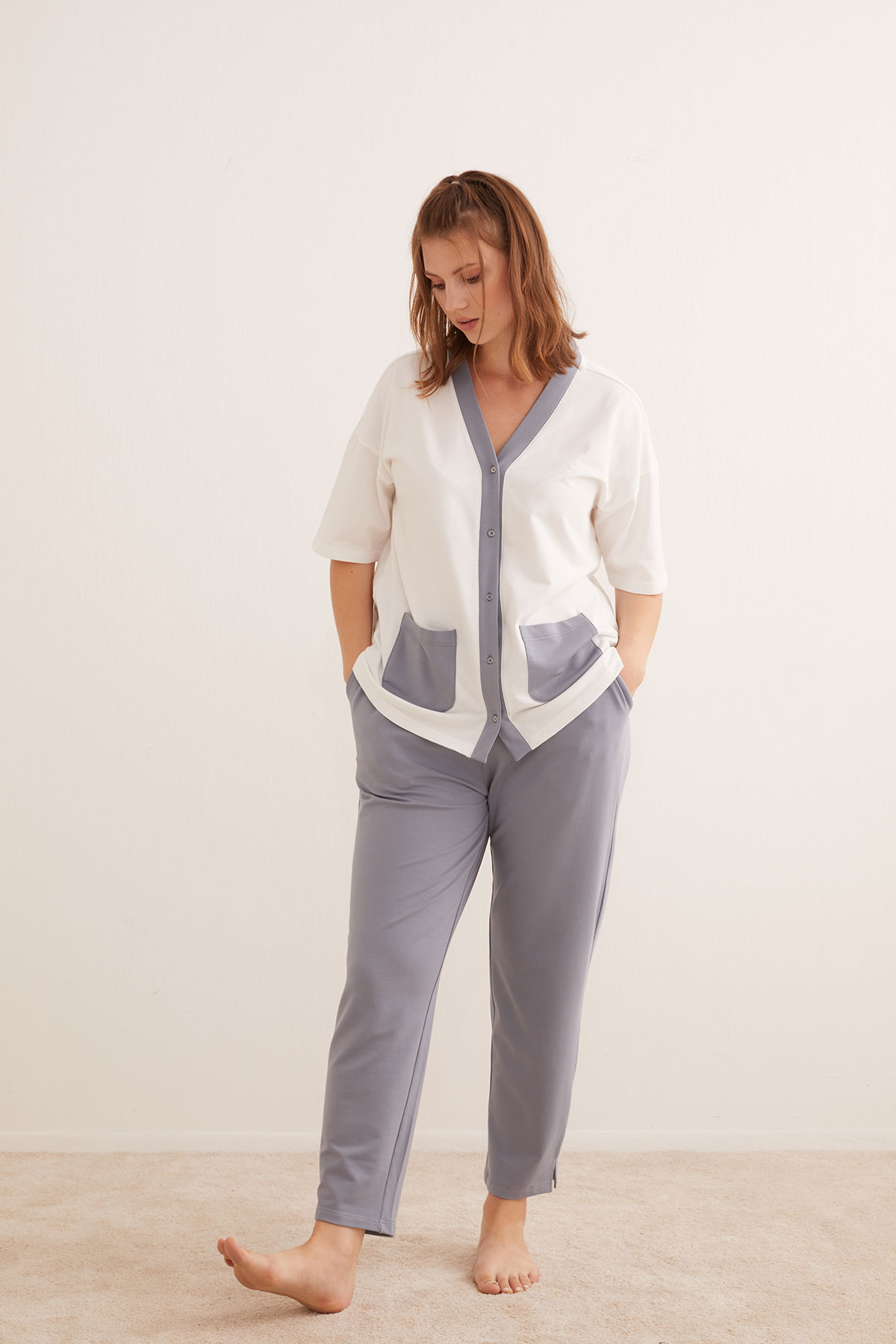 Gömlek tarzı V yaka, kısa kollu pijama gömlek. Önü düğme kapamalı. Bağcıkla ayarlanabilir elastik belli uzun pijama alt. Yumuşak dokulu modal kumaş.