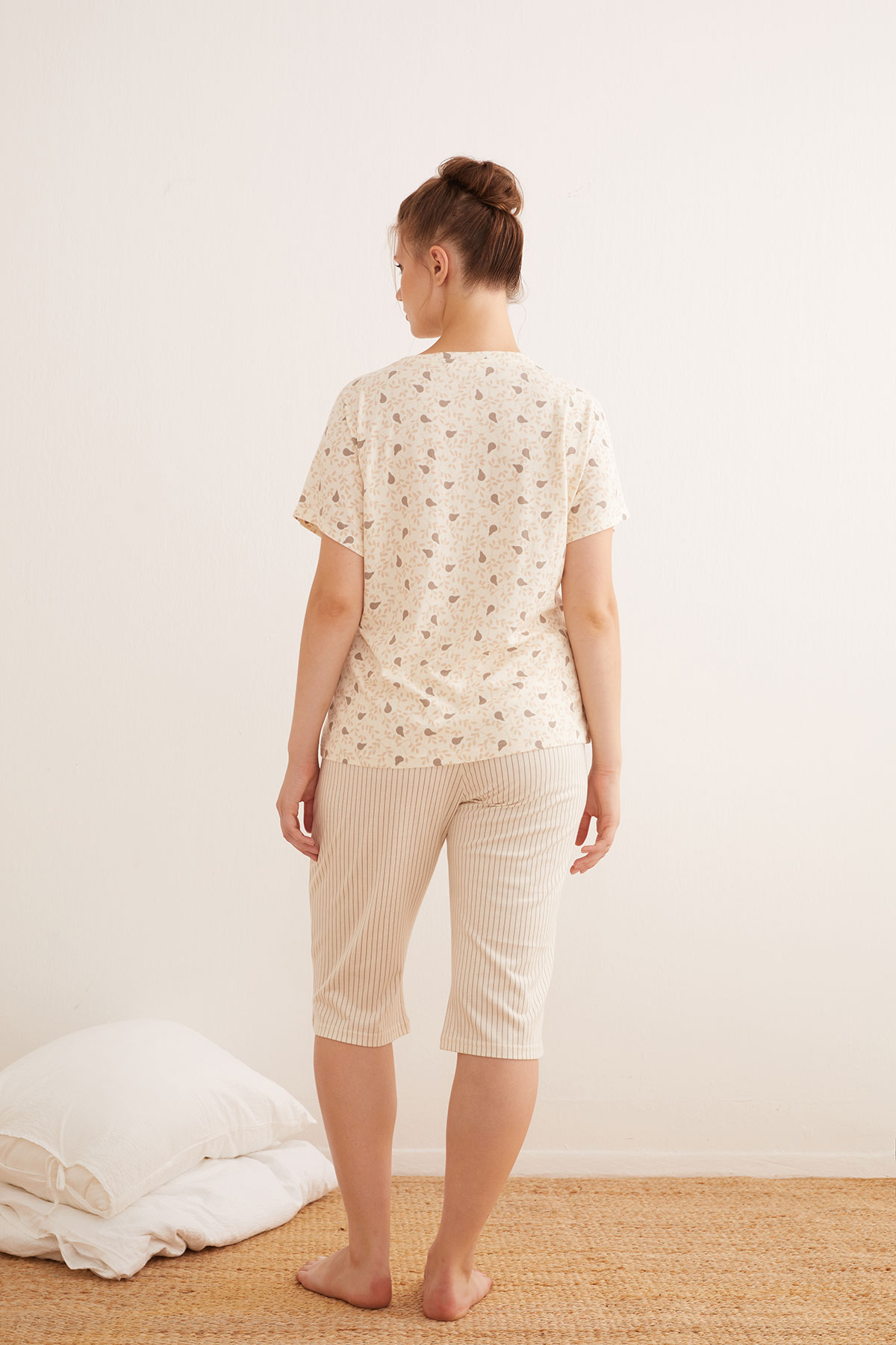 Kısa kollu, bisiklet yaka, cep detaylı pijama üst. Elastik belli kapri. Armut baskılı.