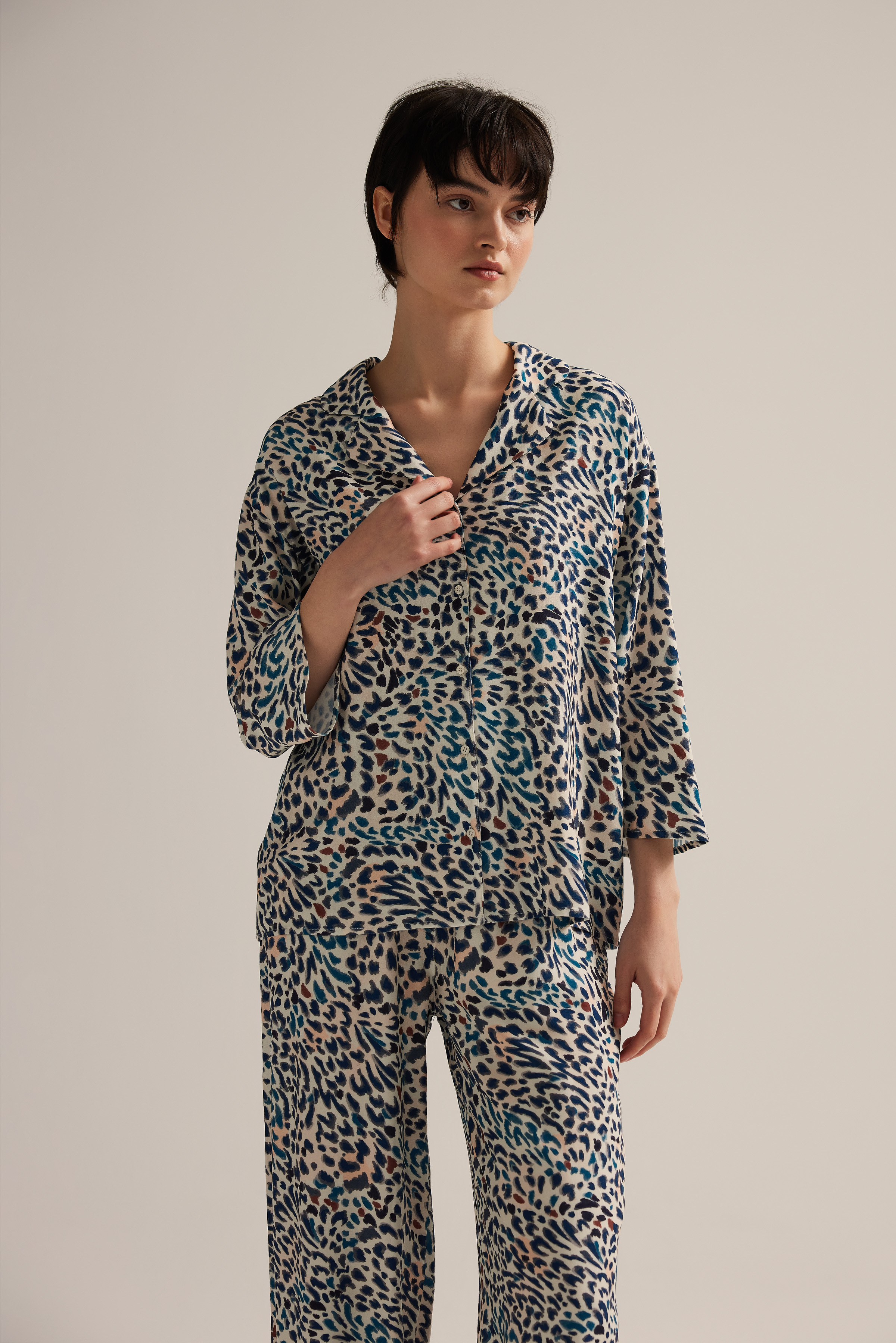 Mavi Leopar Desenli Kadın Dokuma Uzun Kollu Gömlek - 62195-GMK