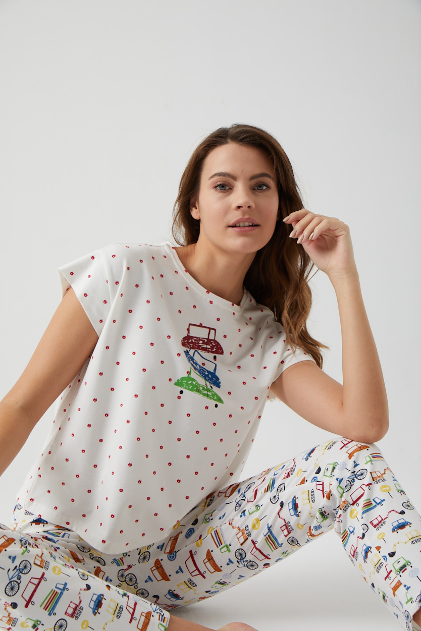 Kadın Kırmızı Elma Baskılı Minik Kollu Pijama Üstü