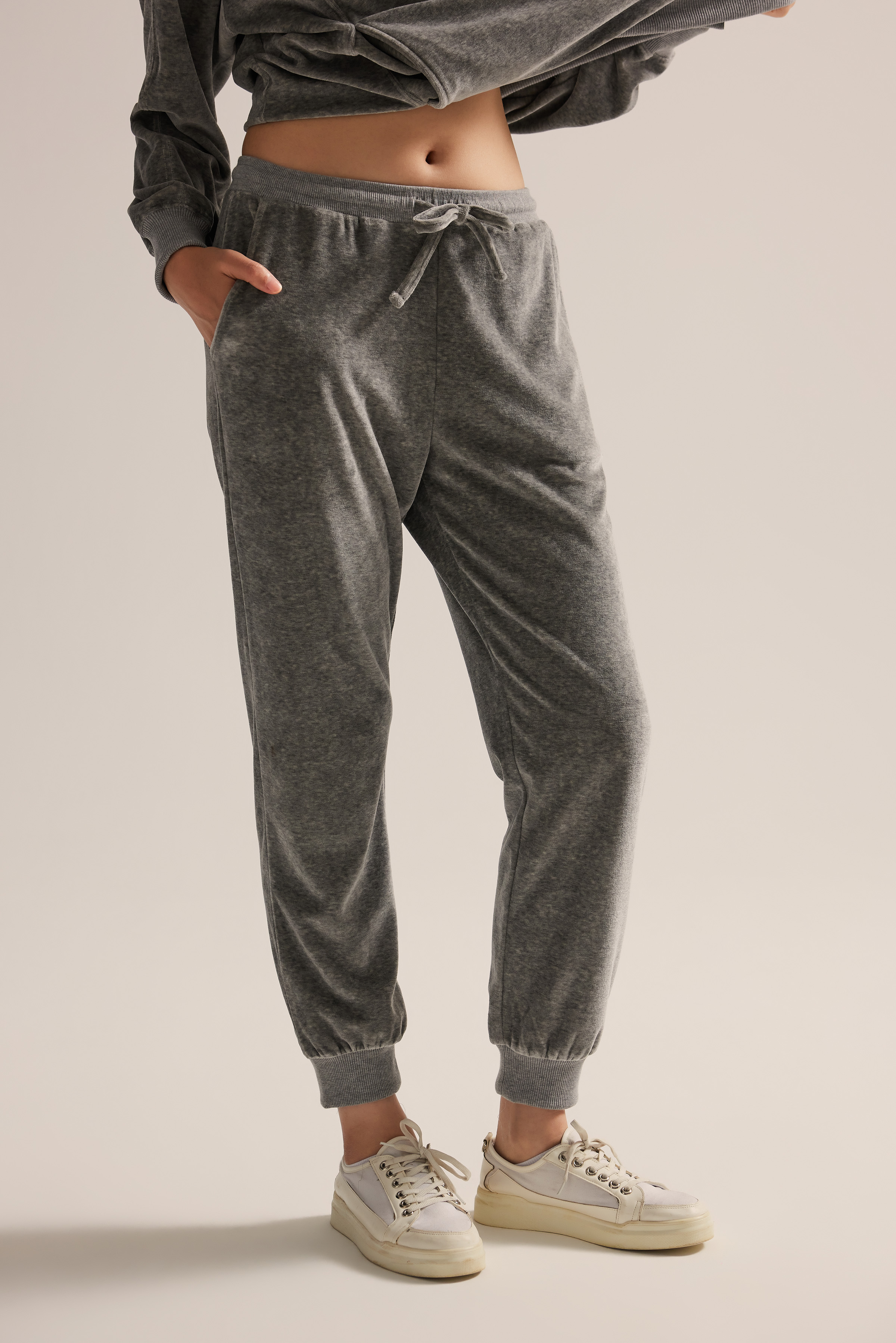 Gri Melanj Kadın Modal Kadife Cepli Uzun Eşofman Altı - 62740-PNT