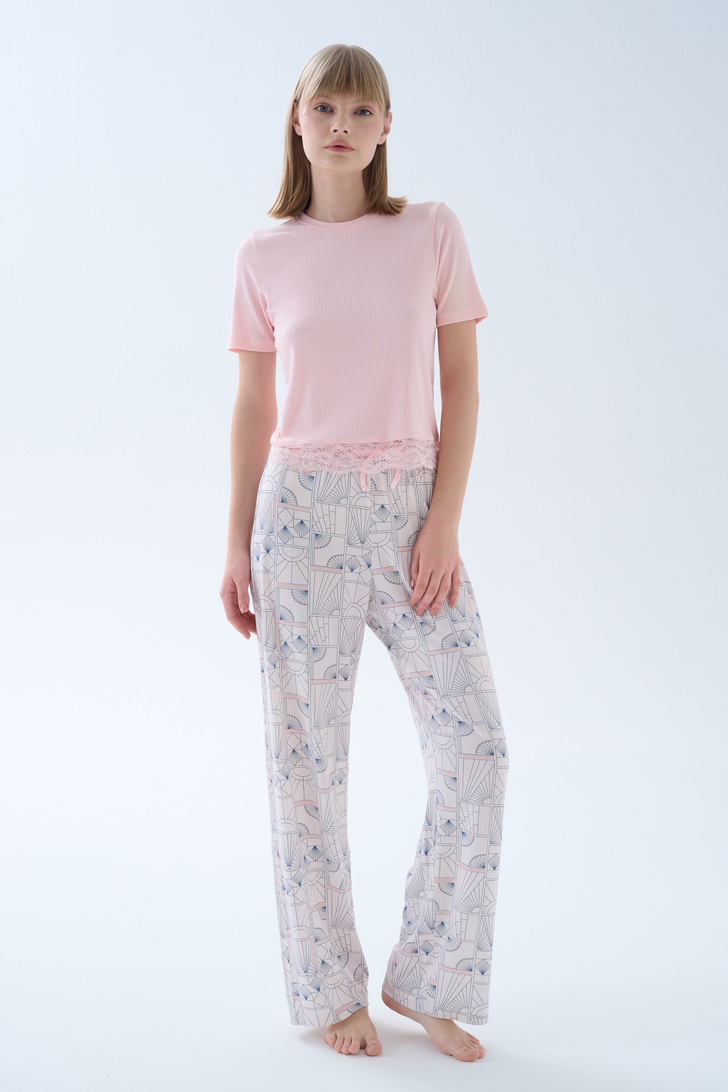 Pembe Kadın Modal Kaşkorse Dantelli Tshirt Uzun Pijama Takımı - 70155