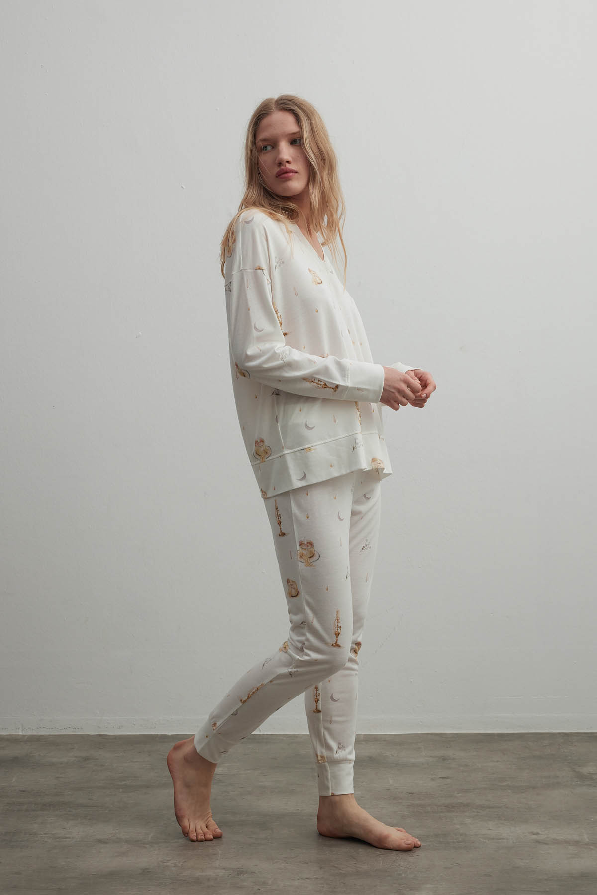 Ekru Baskılı Kadın Pamuklu Cepli Uzun Pijama Altı - 40201-PNT
