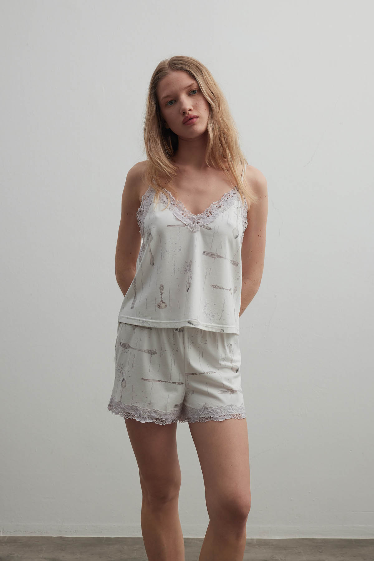 Ekru Baskılı Kadın Pamuklu Dantel Detaylı Şort Pijama Altı - 40321-SRT