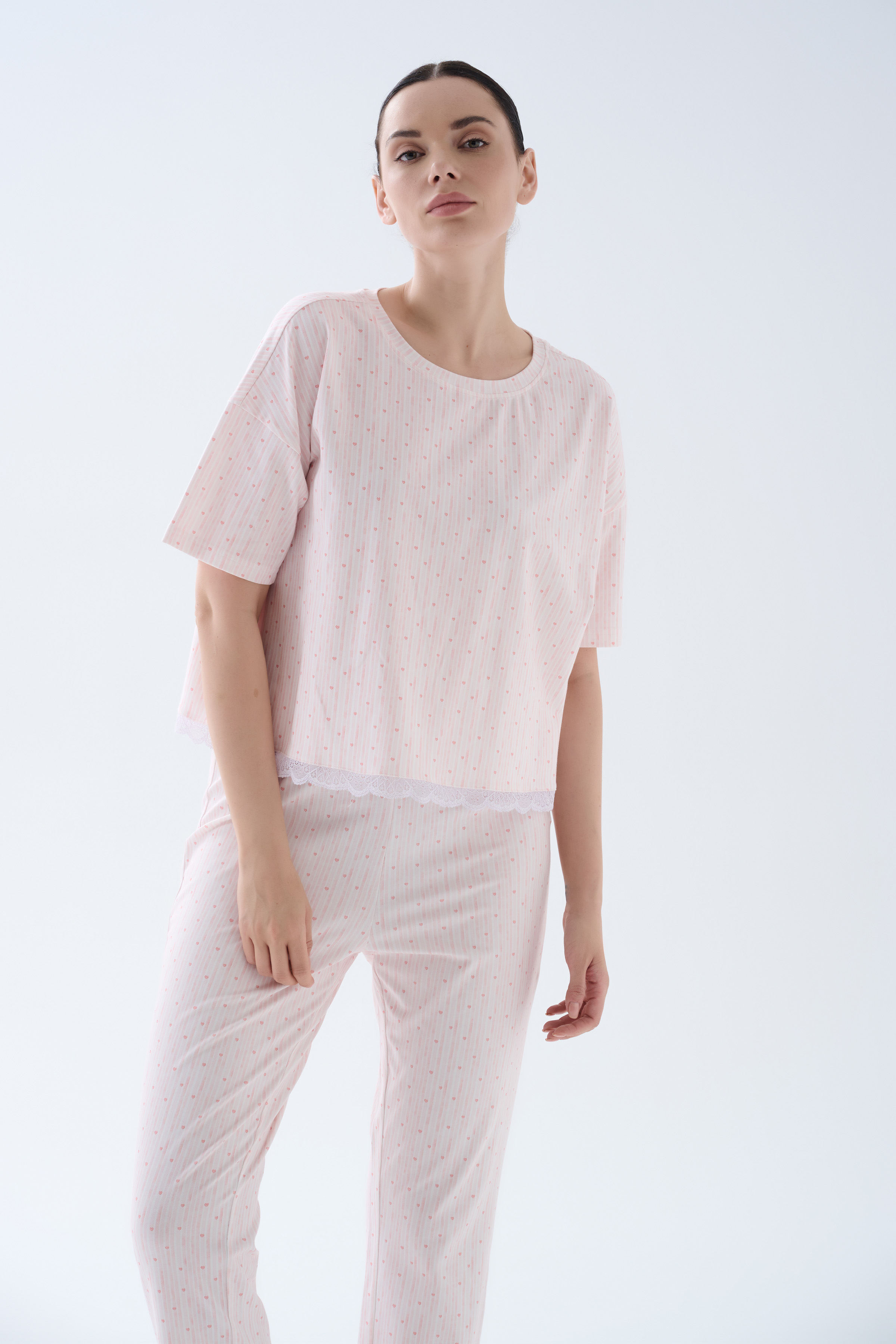 Pamuklu kumaştan tasarlanan bu uzun pijama altı, nefes alabilen yapısıyla gün boyu rahatlık sağlar ve dantel detaylarıyla şık bir görünüm sunar. Pembe baskılı deseniyle tatlı ve modern bir stil tamamlar.