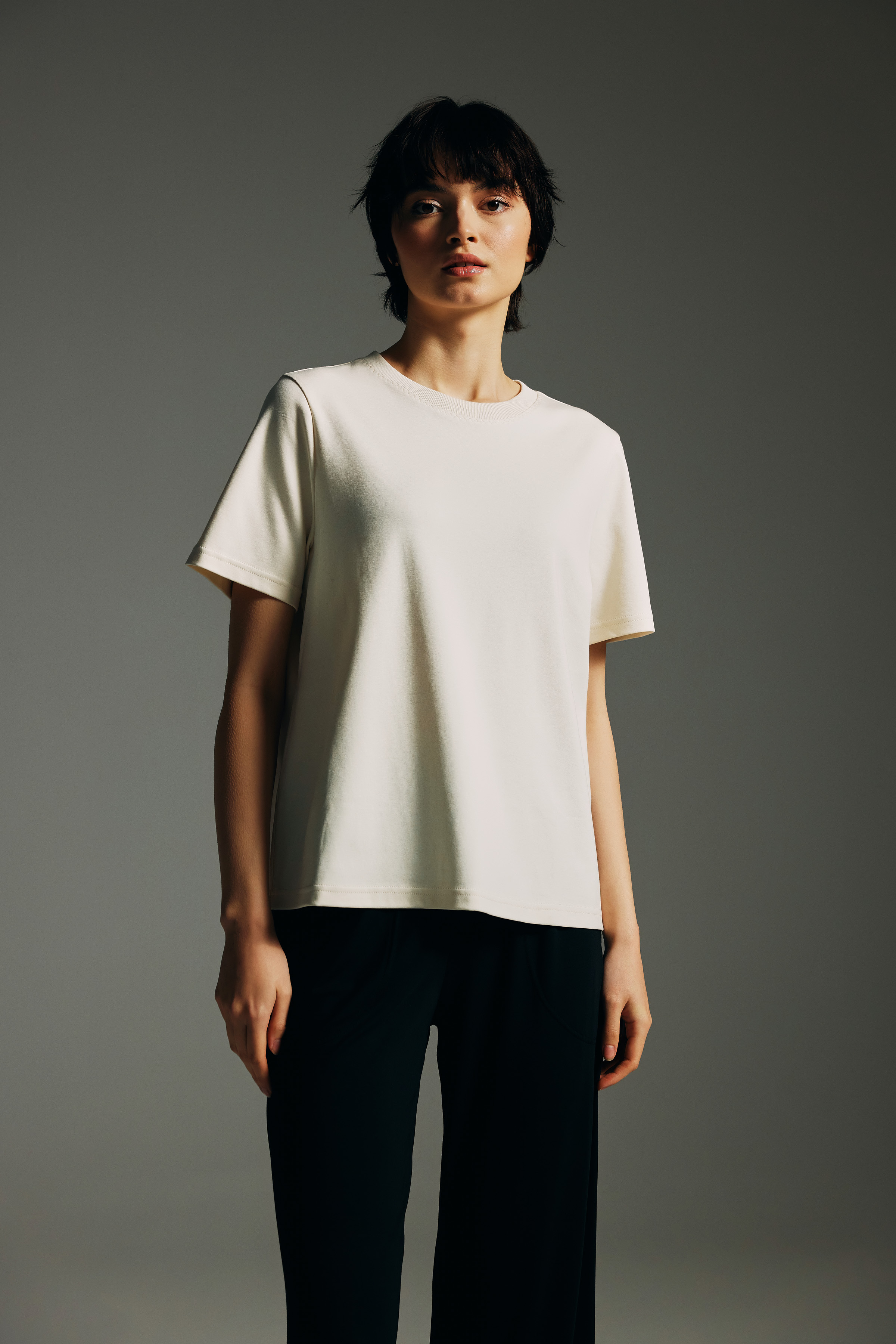 Ekru Kadın Pamuklu Kısa Kollu T-shirt - 50315