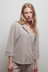 Kahve Melanj Kadın Pamuklu Uzun Kollu Gömlek Pijama Üstü - 40280-GMK