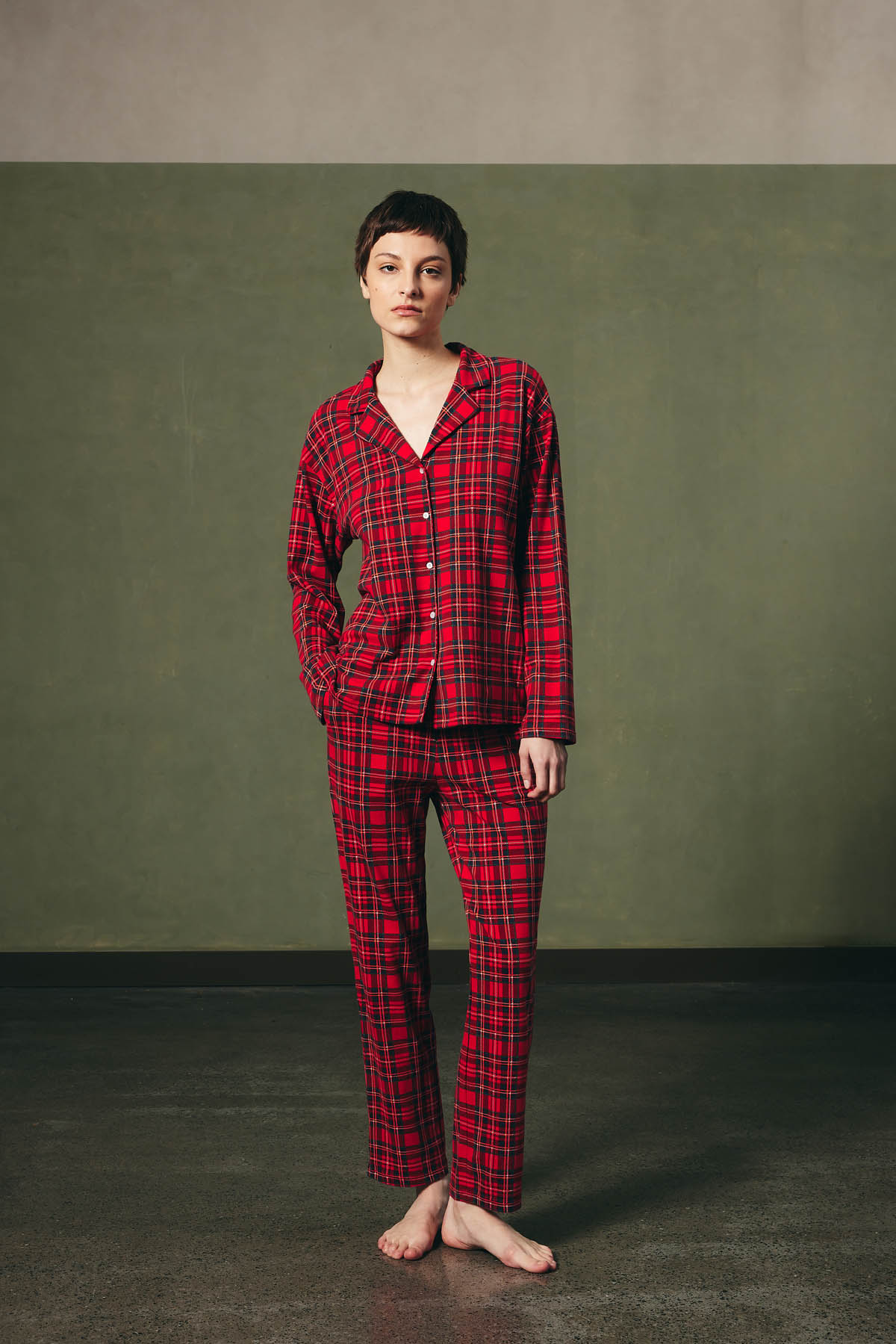 Kırmızı Ekose Desenli Kadın Pamuklu Uzun Kollu Gömlek Pijama Üstü - 40352-GMK