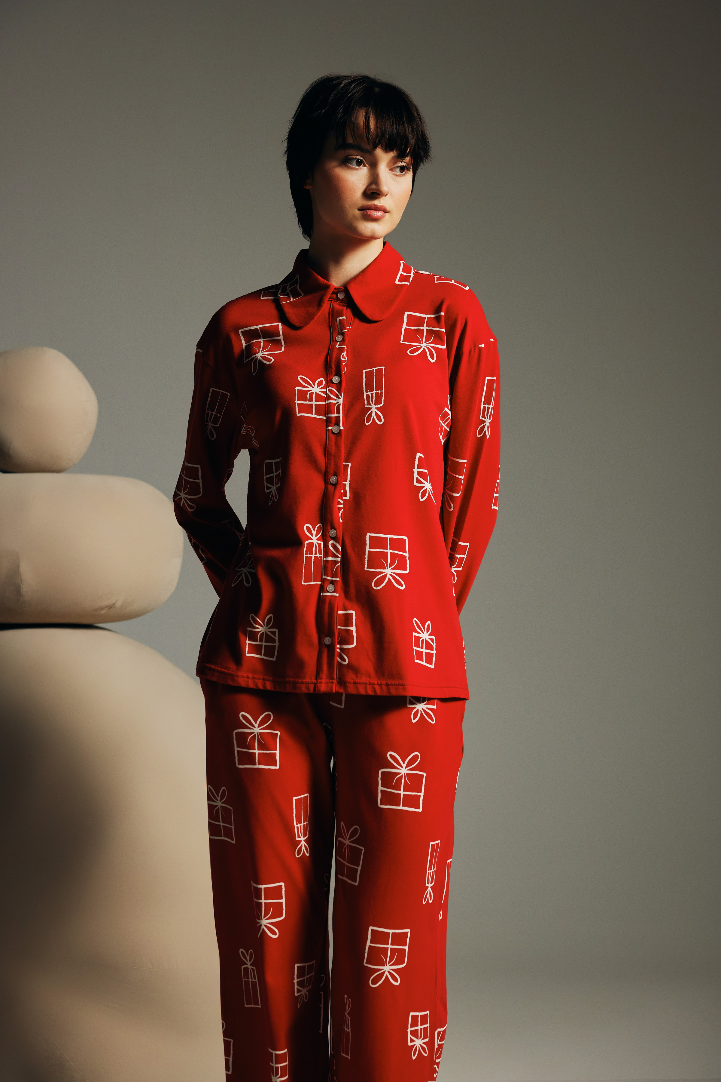Kırmızı Baskılı Kadın Pamuklu Uzun Kollu Gömlek Pijama Üstü - 62161-GMK