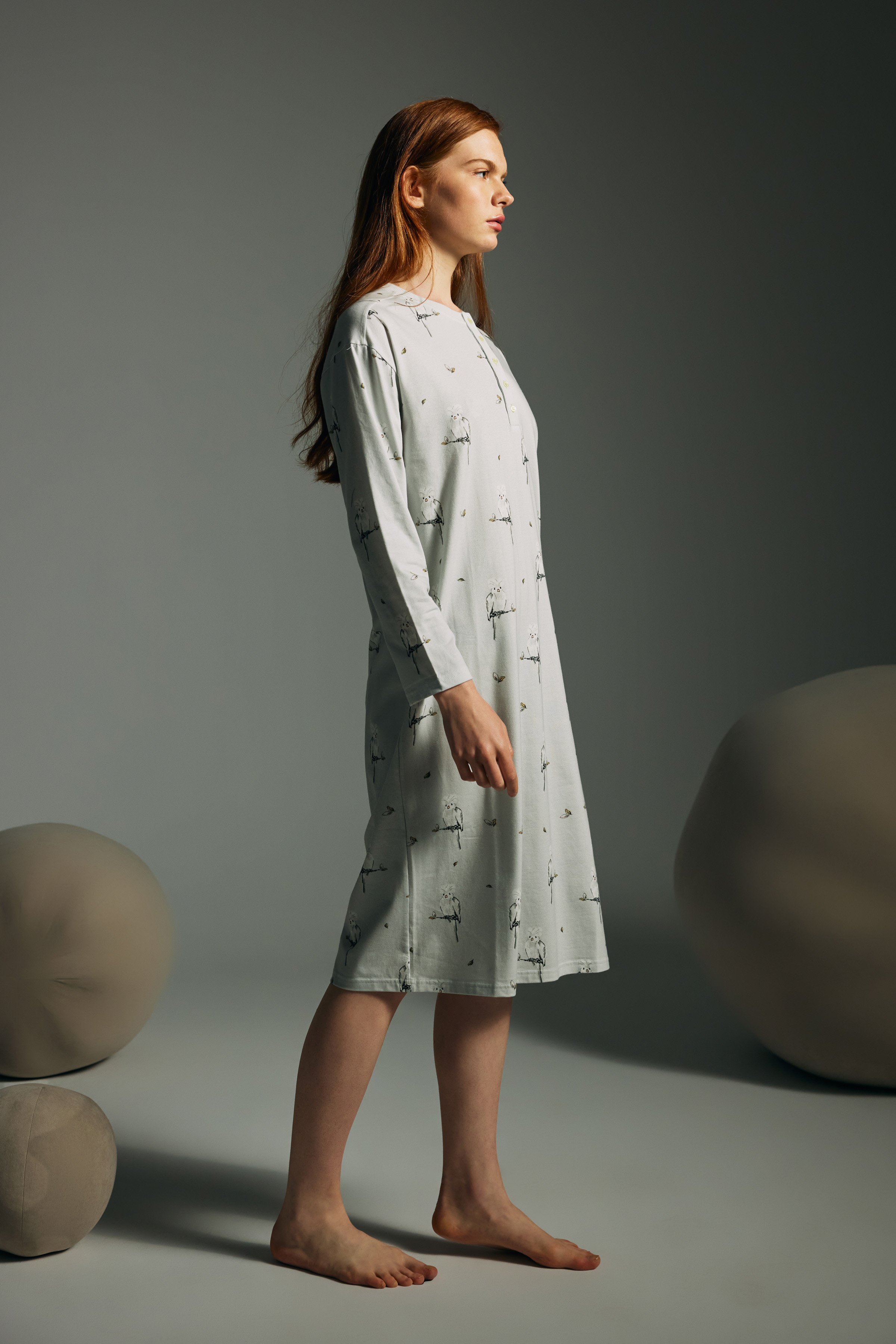 Gri Baskılı Kadın Pamuklu Uzun Kollu Patlı Gecelik - 62246