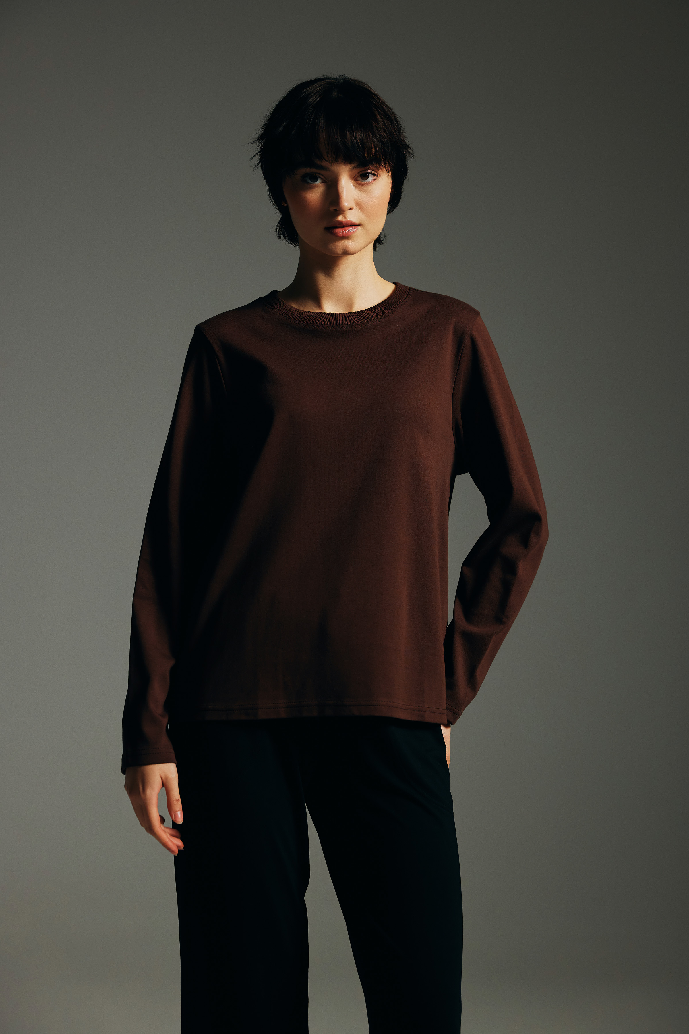 Kahve Kadın Pamuklu Uzun Kollu T-shirt - 62630