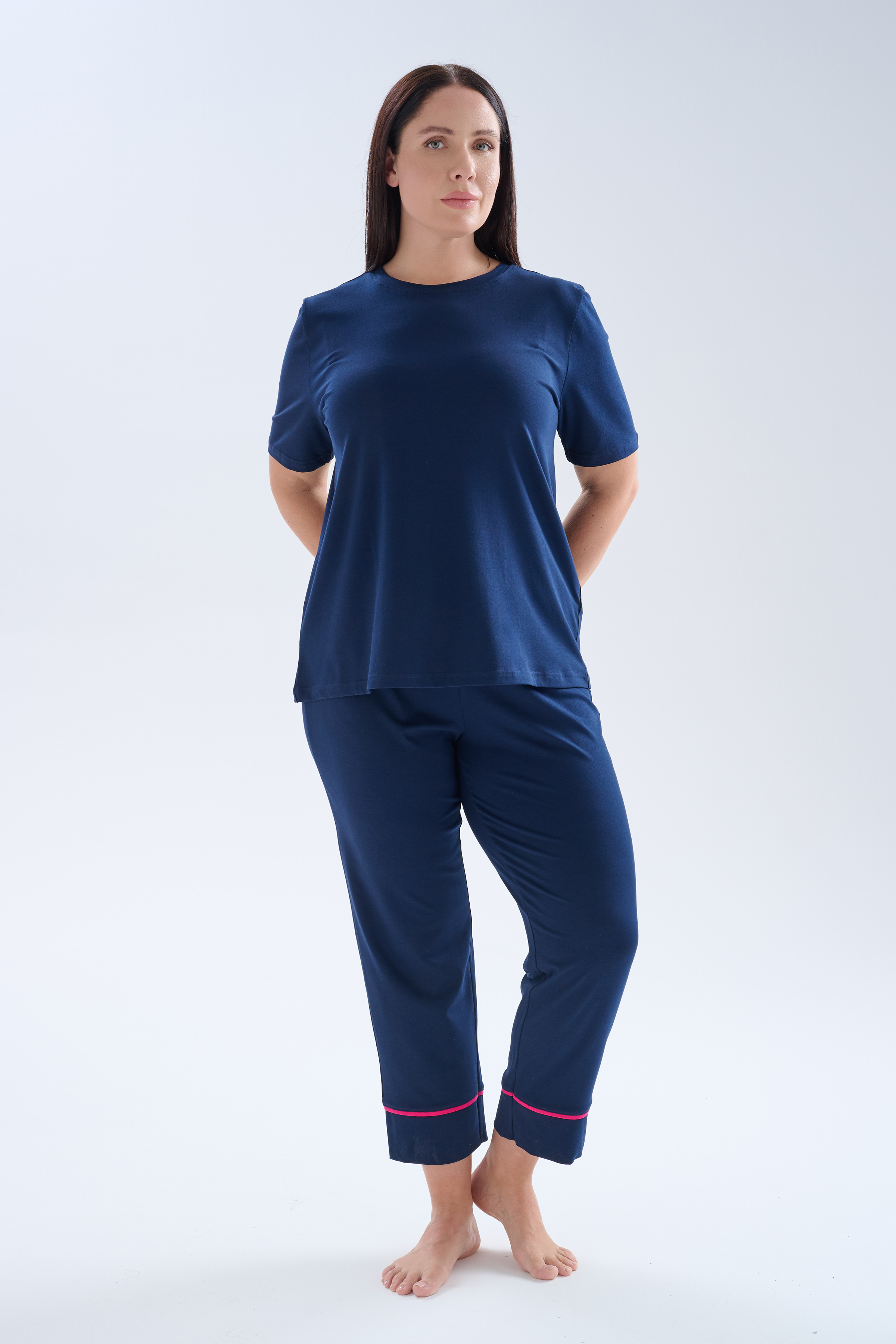Lacivert Kadın Plus Size Pamuklu Kısa Kollu Uzun Pijama Takımı - 70249