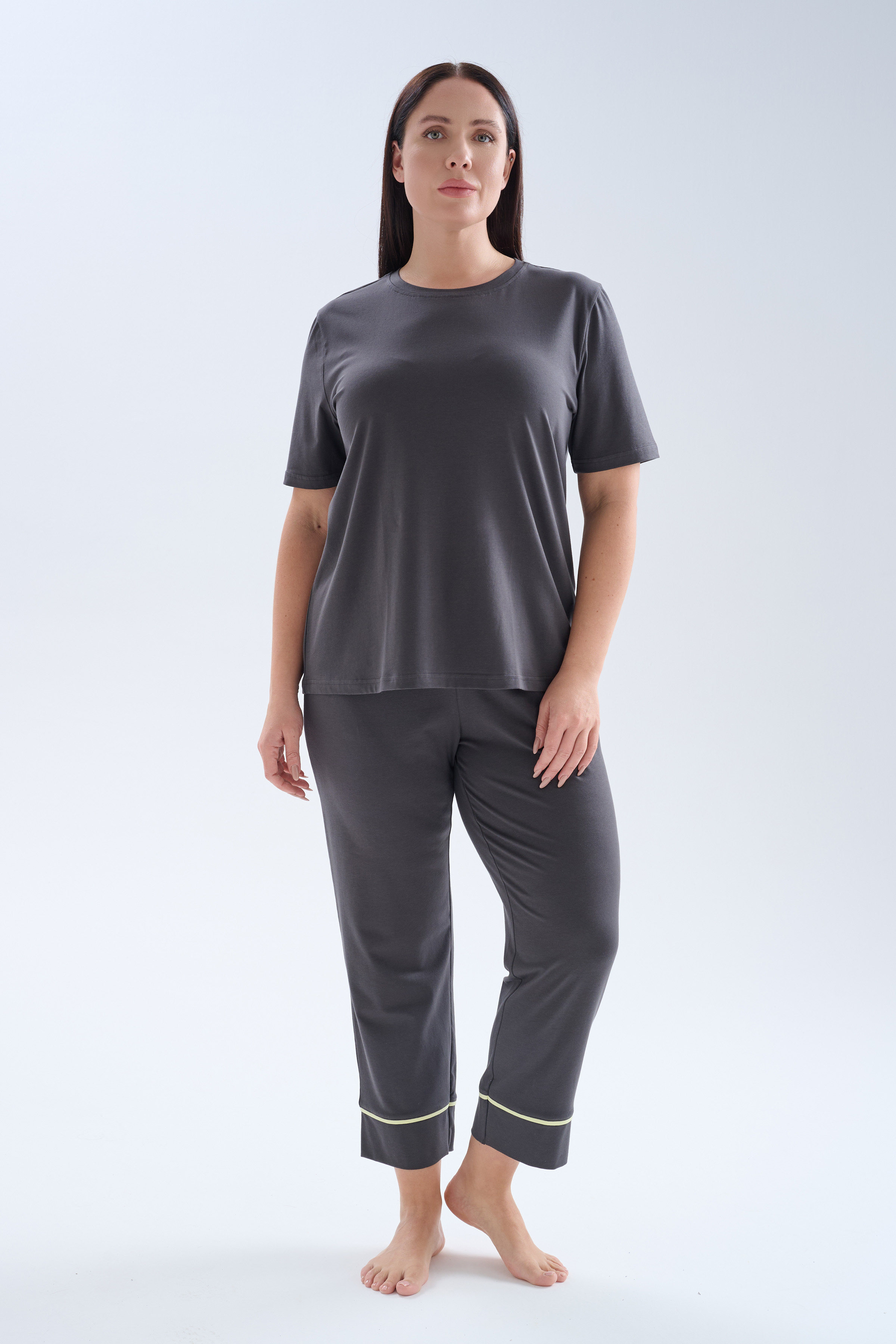 Antrasit Kadın Plus Size Pamuklu Kısa Kollu Uzun Pijama Takımı - 70262