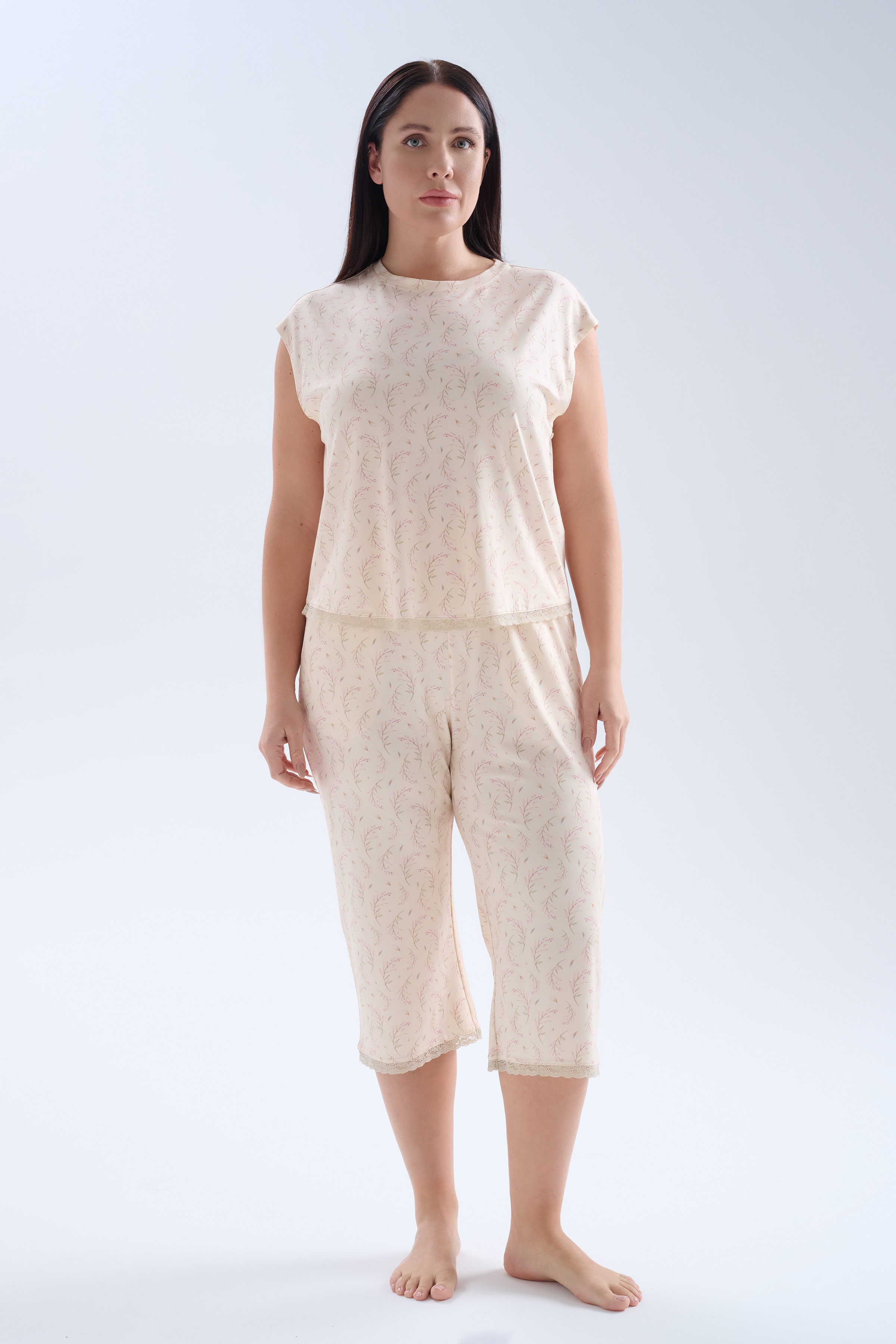 Bej Baskılı Kadın Plus Size Viskoz Kolsuz Kapri Pijama Takımı - 70256