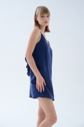 Lacivert Kadın Vegan Dokuma İp Askılı V Yaka Volan Detaylı Elbise - 70596