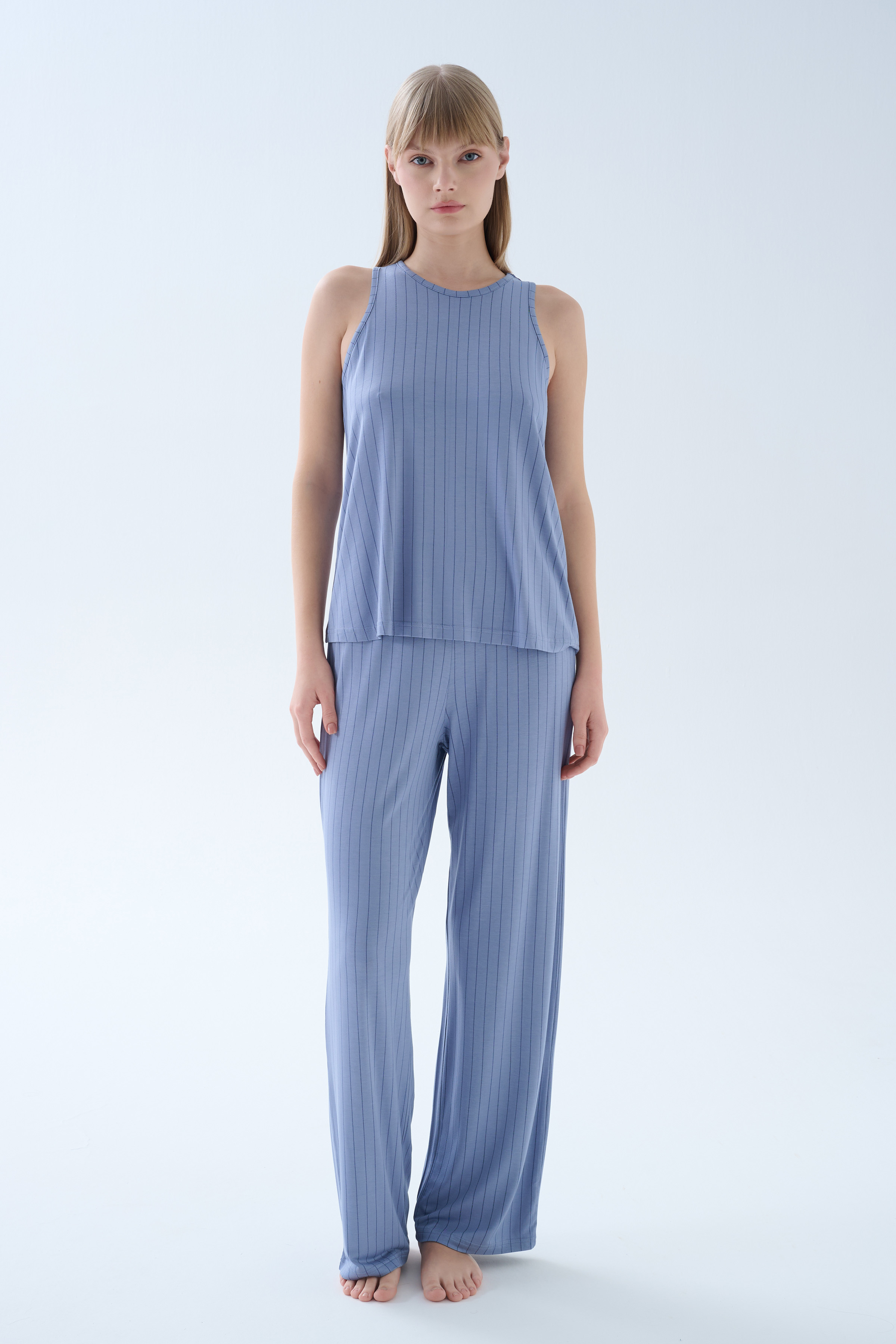 Mavi Çizgili Kadın Viskoz Atletli Uzun Pijama Takımı - 70176